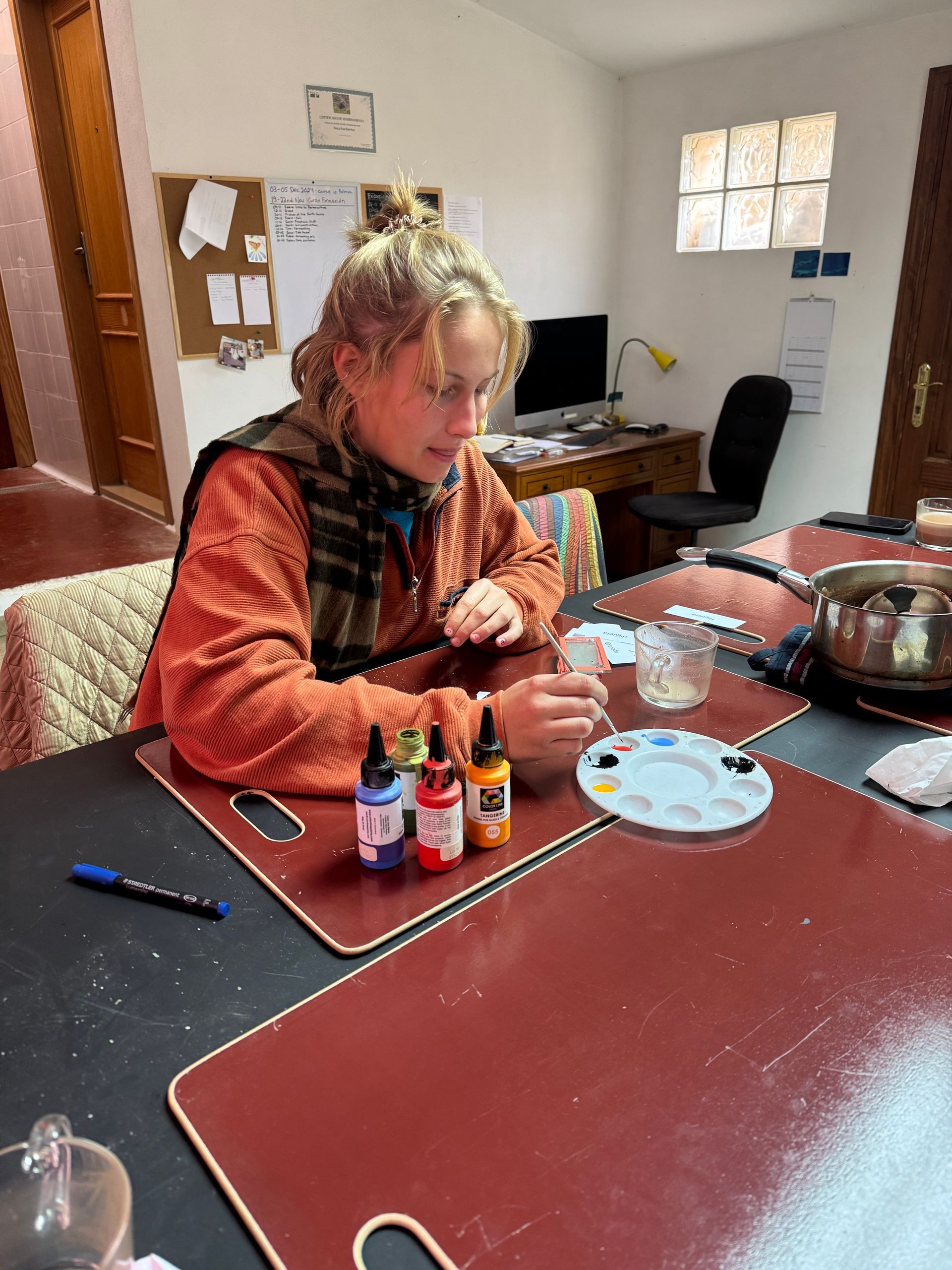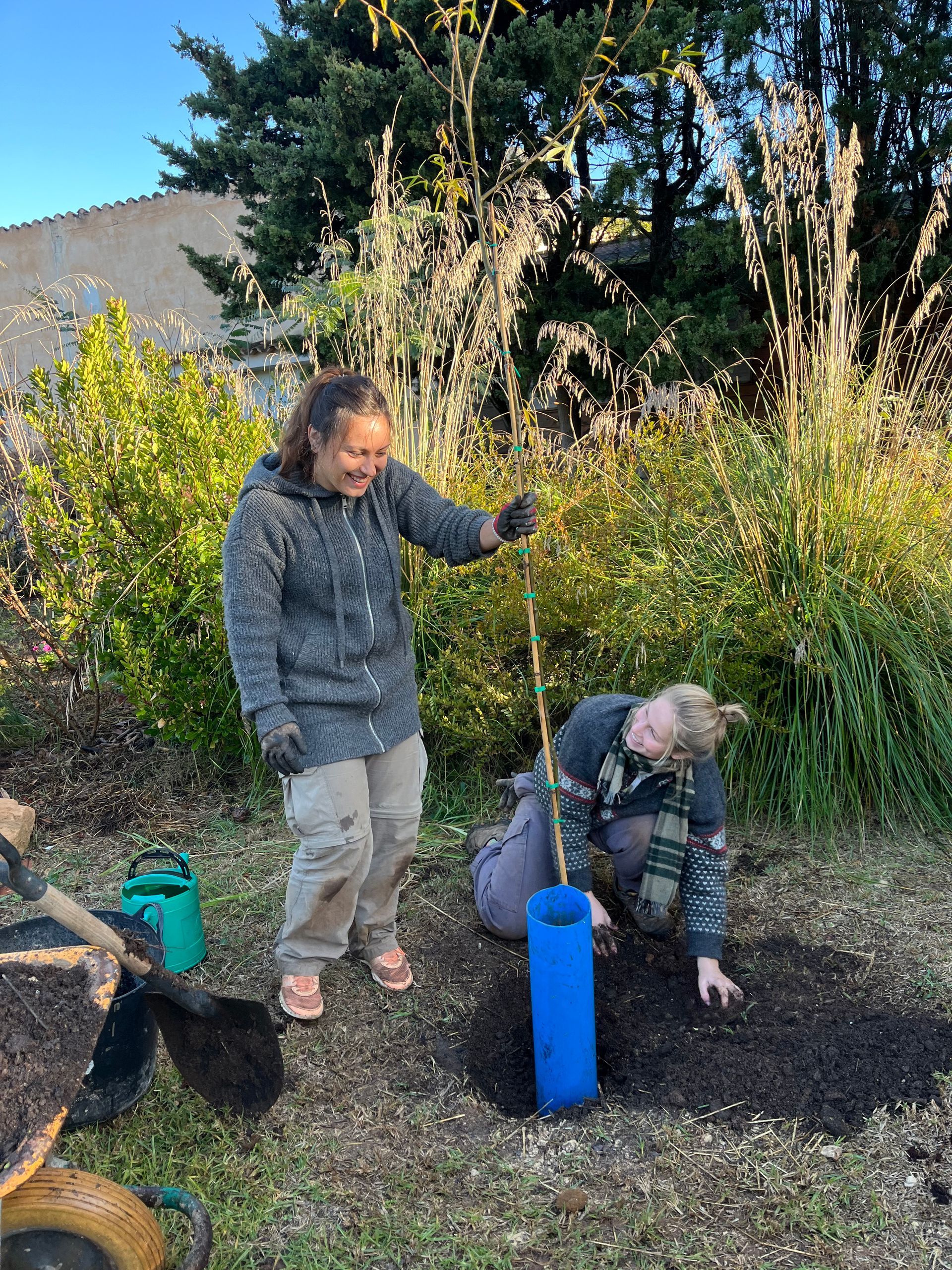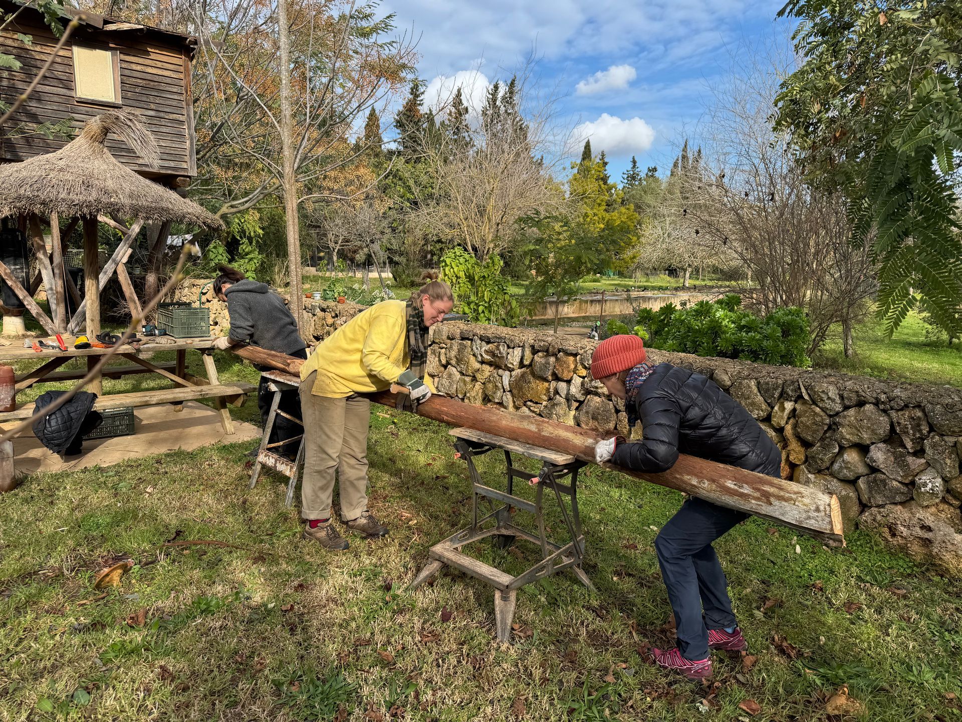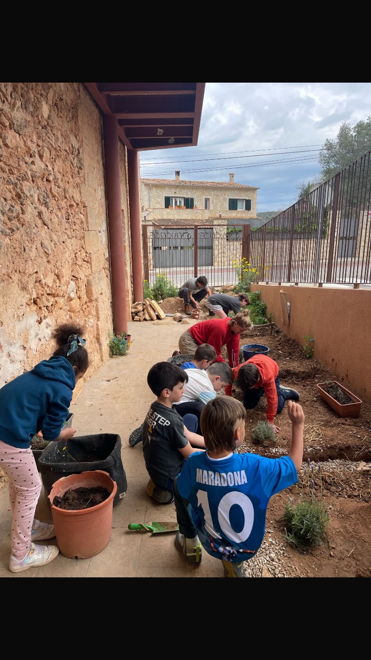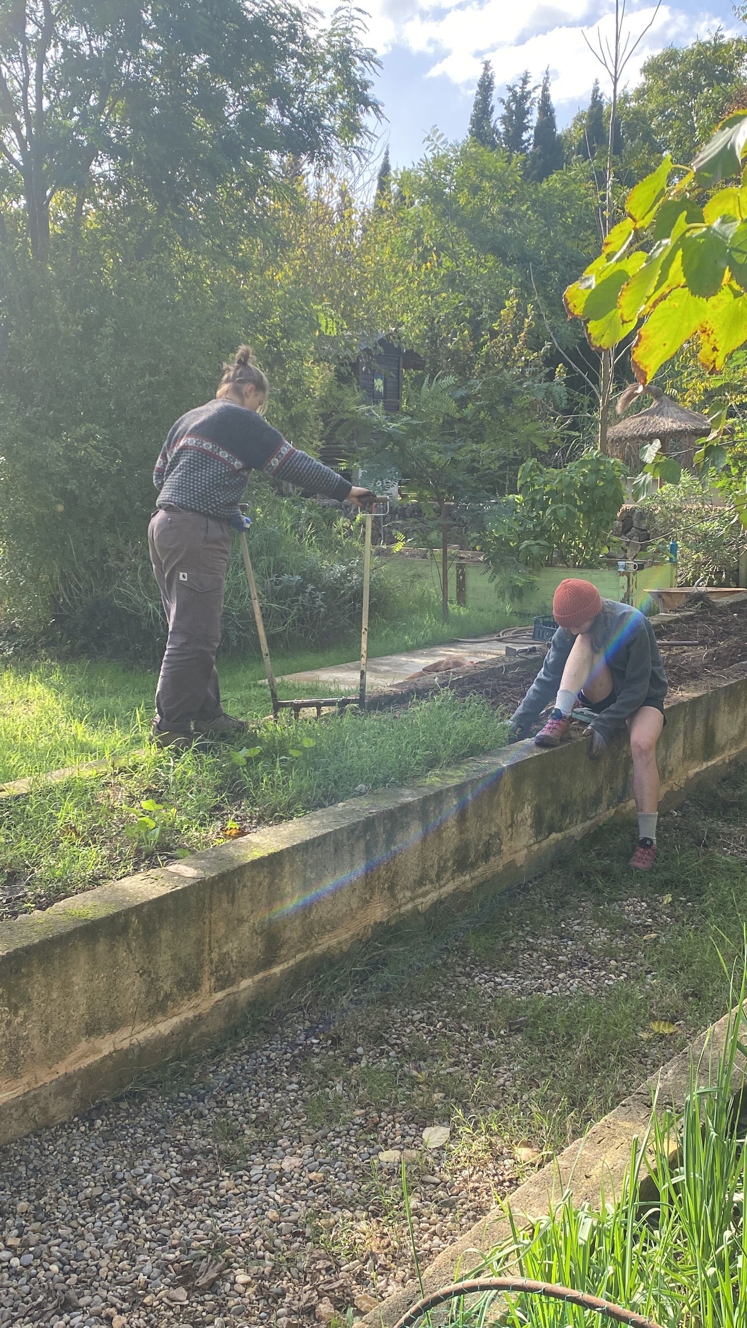 For our work we were taught to pay attention to the details and to the small changes. It also showed me to look at nature from different perspectives and to continuously find beauty in my surroundings. After work I had a lot of free time to discover the island with the train or bike, to read books and find new ways to express my creativity. My highlights were hiking in the Tramuntana the GR221 trail including a sleepover in the Refugio, cowboy camping on a lonely beach and snorkelling in a beautiful cala, and seeing an octopus. Between the adventures we had, we spent time together with Maja and Alex ( Also Elena and Eliza for a shorter period of time) chatting , playing games or watching silly movies, which made every day life so precious. Planting trees, weeding and watering were our every day tasks. Besides that we made excursions and saw and learned about other Permaculture Fincas or build for example a greenhouse from old glass windows. We also planted vegetables in our own garden and harvested broccolis, paprikas and onions.